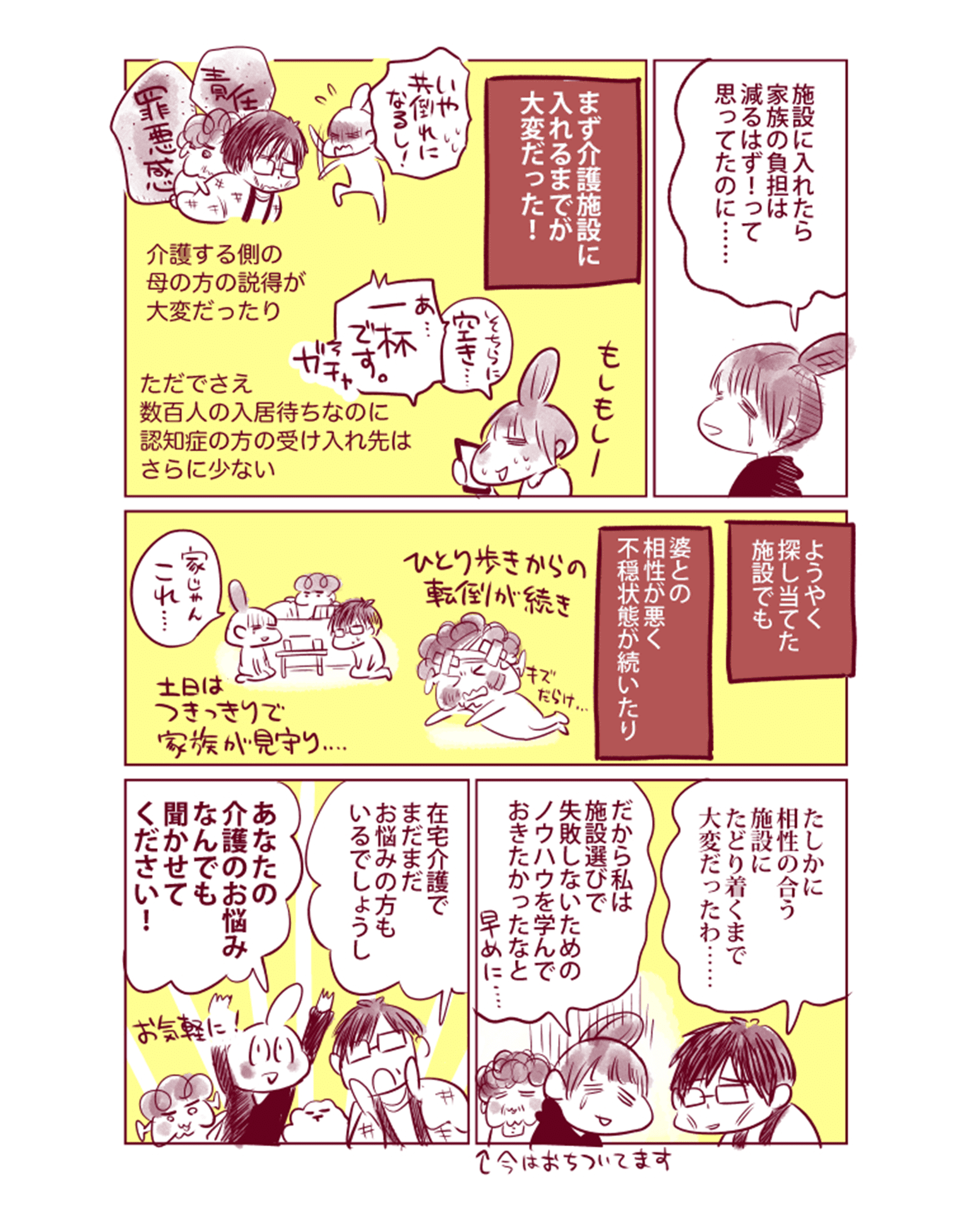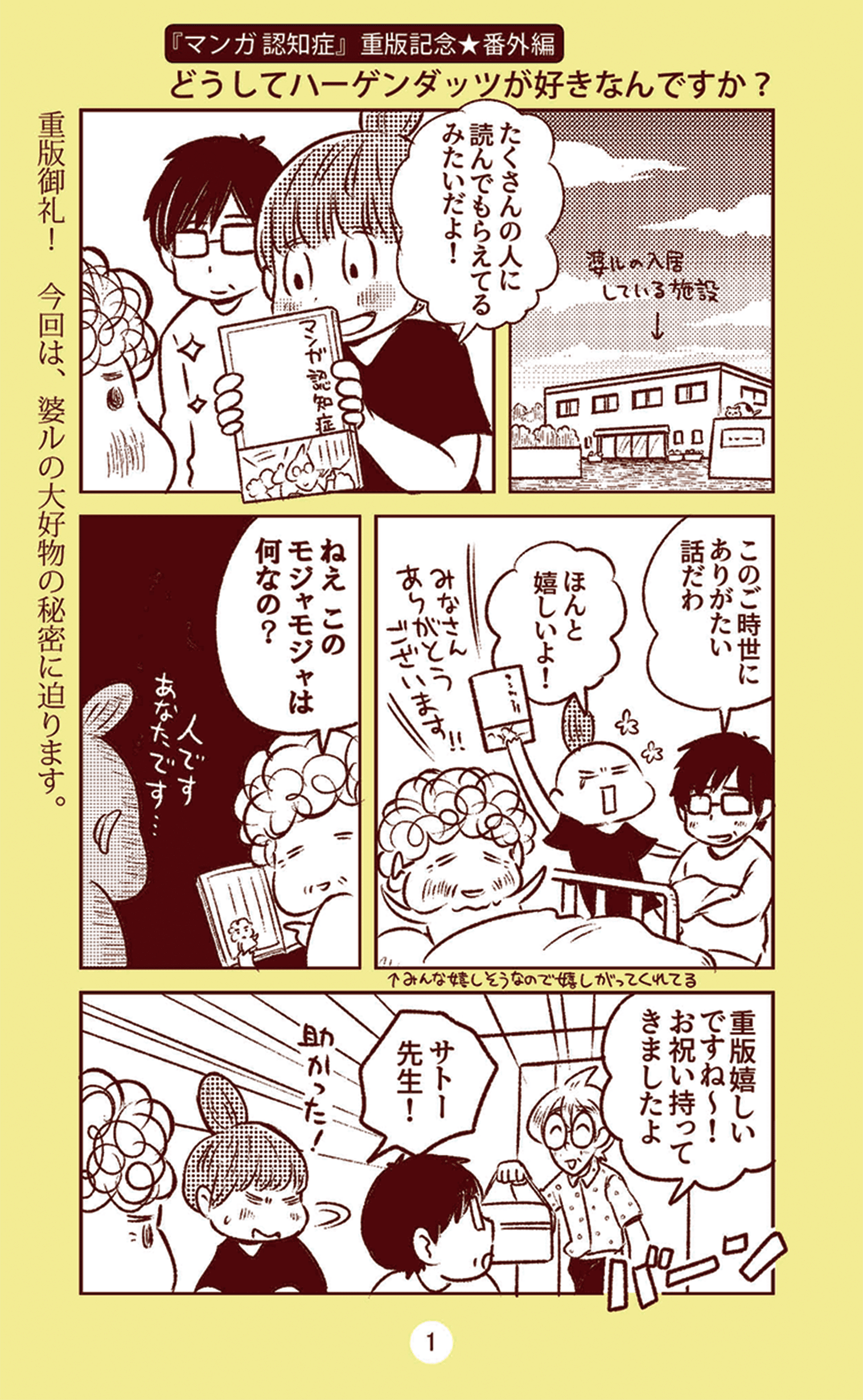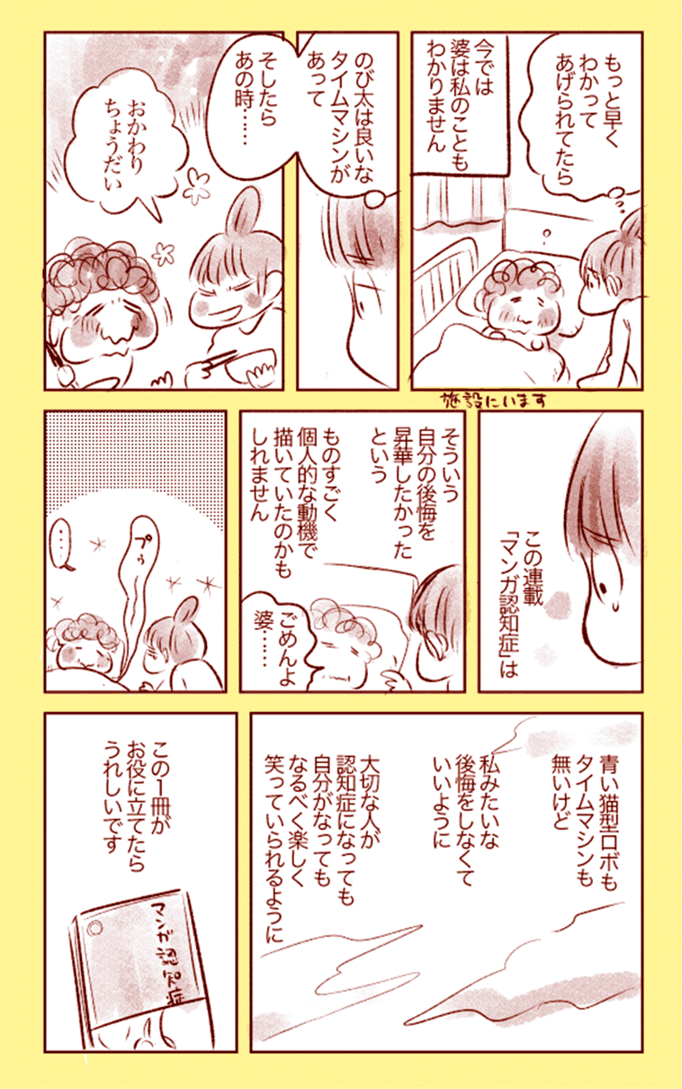 94歳の祖母は、2021年の3月に新型コロナウイルス感染症になりましたが、なんと無事に生還しました。しかし、祖母はヘルパーさんや母と私の通い介護を受けながら一人暮らしをしていたため、入院をしたことにより認知機能やシモの方が更に衰えてしまいました。そこで家族や親族、ケアマネージャーさん達と協議の末、祖母を介護施設に入所させることにしました。ここでも介護施設という選択肢を視界に入れることができたのは、マンガ認知症のおかげでした。介護施設という選択肢は悪いことではないことや、自宅介護の限界の目安をしっかり書いて頂いたため、過剰な罪悪感を感じることなく、祖母が一番安全に暮らせる選択肢を選ぶことができました。マンガ認知症には数え切れないほど救われてきました。祖母、母、私の人生を支えていただきました。